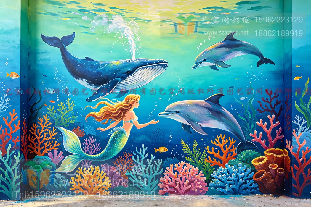 如果说游乐园是承载欢乐的天堂,那么海洋世界彩绘,便是为这个天堂披上了一层梦幻的蓝色纱衣。我们以匠心致初心,将海底世界的奇幻与童真,通过细腻的彩绘笔触,融入游乐园的每一个角落,让每一位访客都能走进童话般的海底世界,邂逅不期而遇的美好与惊喜。走进园区仿佛瞬间穿越时空,闯入了一个五彩斑斓的海底童话王国。主通道的两侧,巨型彩绘将海底的昼夜美景完美呈现:白日里,阳光穿透海面,洒下细碎的金光,成群的热带鱼在波光粼粼的海水中穿梭,斑斓的鳞片在光影下闪烁,像是撒在海底的星星;夜幕下,荧光彩绘点亮整个园区,发光的水母拖着长长的裙摆,在黑暗中翩翩起舞,温柔的蓝光、梦幻的紫光交织在一起,营造出神秘而浪漫的氛围,仿佛置身于海底星空。园区的各个区域苏州手绘都与游乐项目完美融合,让欢乐加倍。墙面上绘着凶猛却可爱的鲨鱼,张开的嘴巴仿佛在为勇敢的冒险者呐喊助威;环绕着小巧玲珑的贝壳、海星,搭配着柔和的蓝色彩绘,瞬间更具童话感;亲子互动区的墙面,更是被绘上了卡通版的海底家族,憨态可掬的海龟、活泼好动的小丑鱼、温柔善良的美人鱼,孩子们可以在这里与“海底伙伴”合影,尽情释放童真。